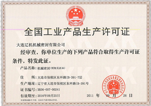 大连凯时AG机械密封公司取得全国工业产品生产许可证证书