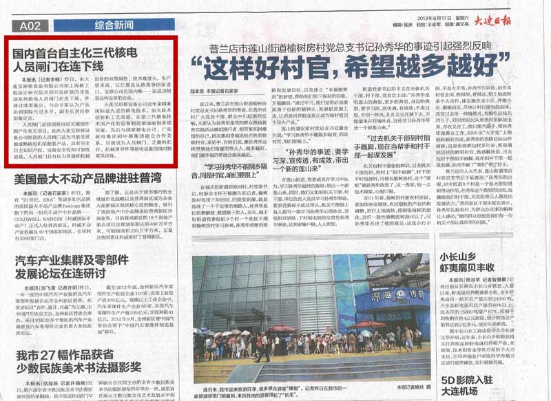《大连日报》在2013年8月17日 A02版,以“海内首台自主化三代核电人员闸门在连下线”为题目对大连宝原核设备有限公司“自主化非能动系列核电厂人员闸门样机”结果鉴定会进行了报道。原文转载如下: