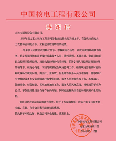 2014年是中国核电工程有限公司方家山核电工程并网发电决战胜负的要害之年,宝原公司项目人员一直以来高度重视项目现场的技术效劳,不厌其烦,随叫随到,提供了周到的效劳。为此,方家山现场项目部对宝原公司项目组人员给予的效劳和支持体现真切的谢谢,并发来《谢谢信》。