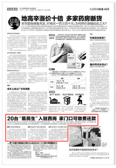 《半岛晨报》在2015年6月16日A23版,以“20台‘易民生’入驻西岗,家门口可缴费还款”为题目对大连迅通网络技术有限公司“易民生”智能终端进行了报道。原文转载如下: